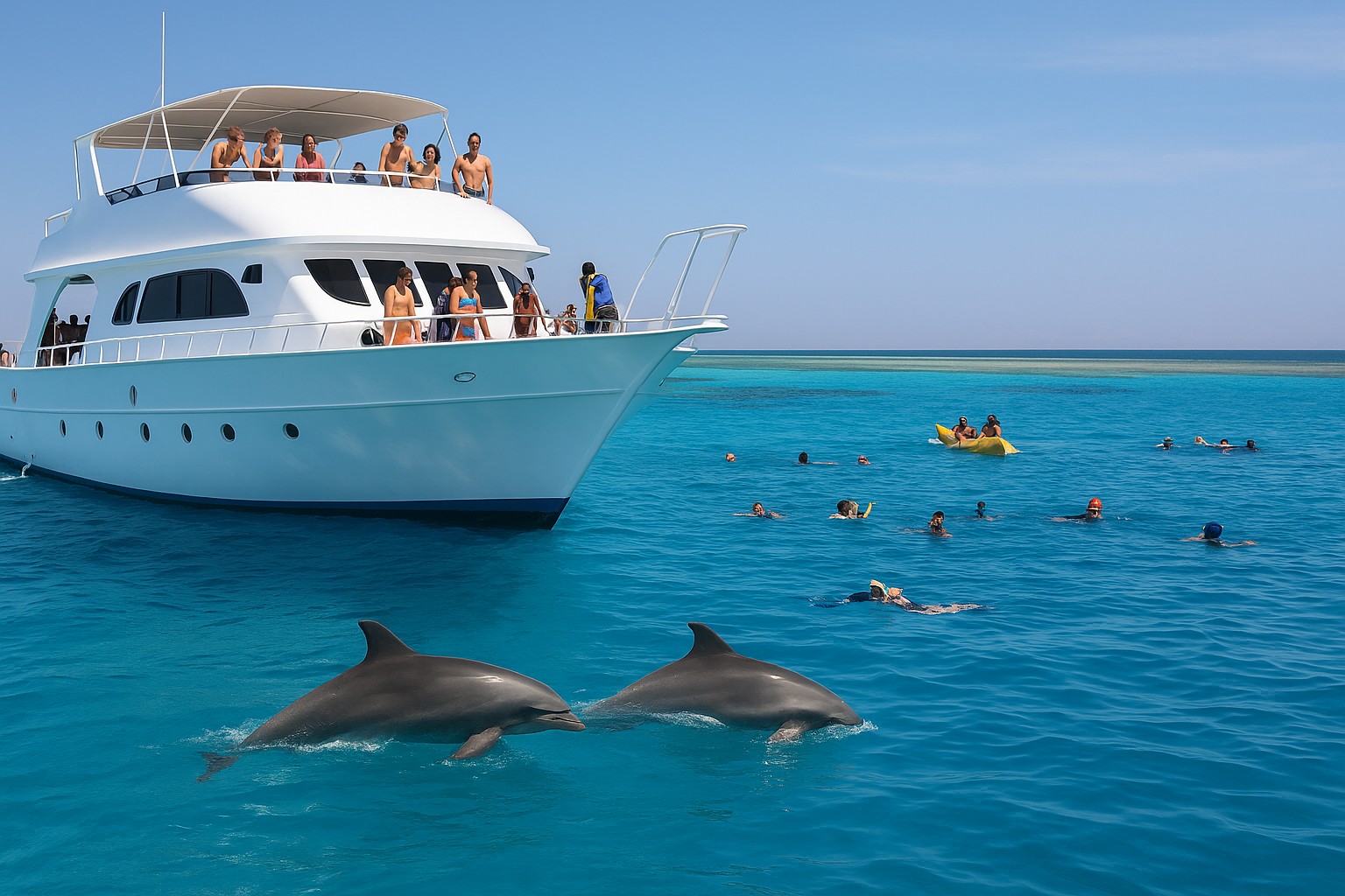 Dopo il ritiro presso il vostro hotel a Hurghada, guiderete con un veicolo con aria condizionata fino alla barca, dove sarete accolti dal capitano e dall'equipaggio. Inizierete così un indimenticabile viaggio di snorkeling nei luoghi dove è più probabile che si vedano i delfini, con una probabilità del 90% di vedere i delfini.