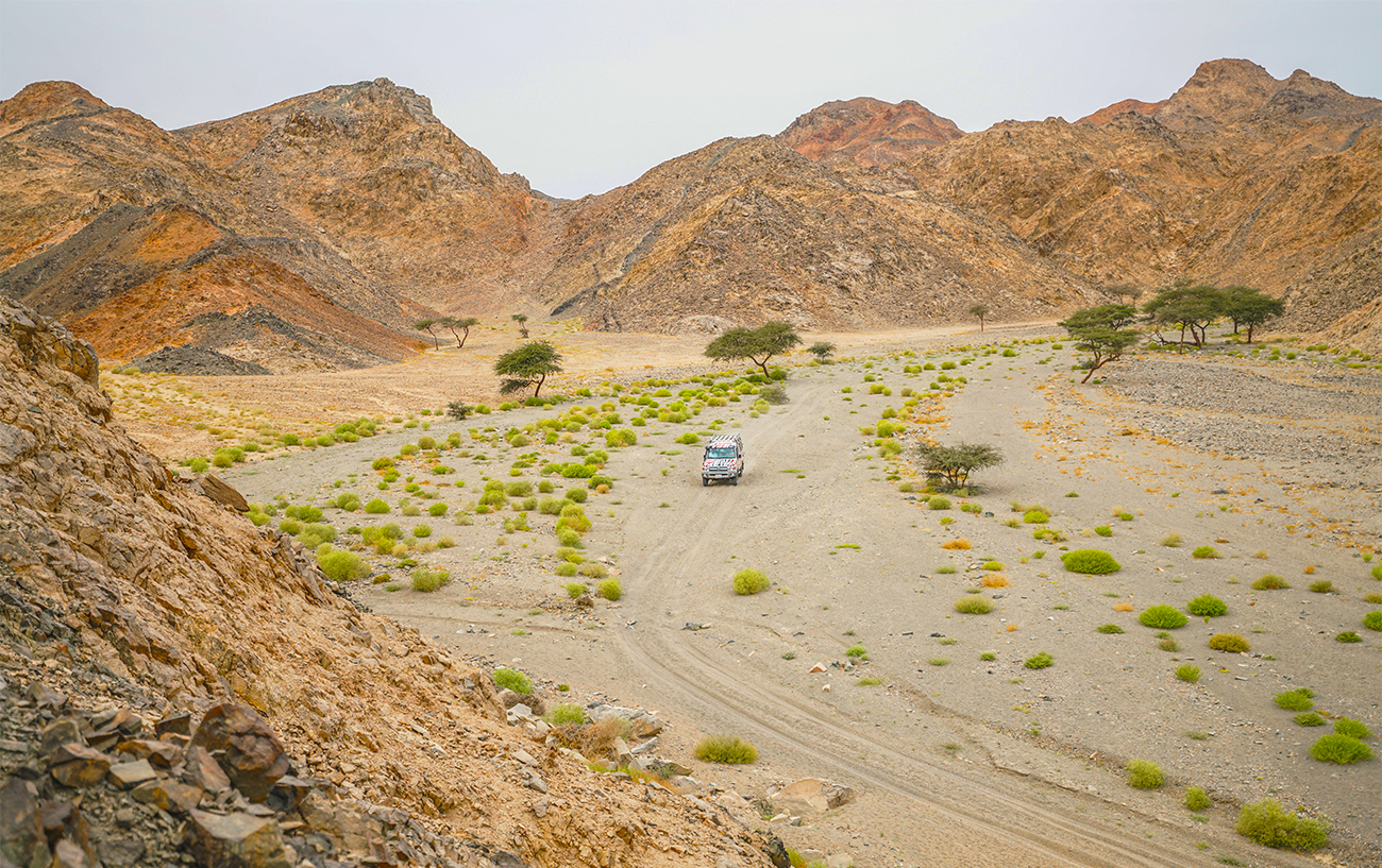 L'escursione vera e propria inizia da qui. Dopo un breve giro in Land Cruiser, ci si ferma all'acacia, l'unico albero che resiste al clima del deserto. Si prosegue su una montagna da cui si gode di una splendida vista panoramica.