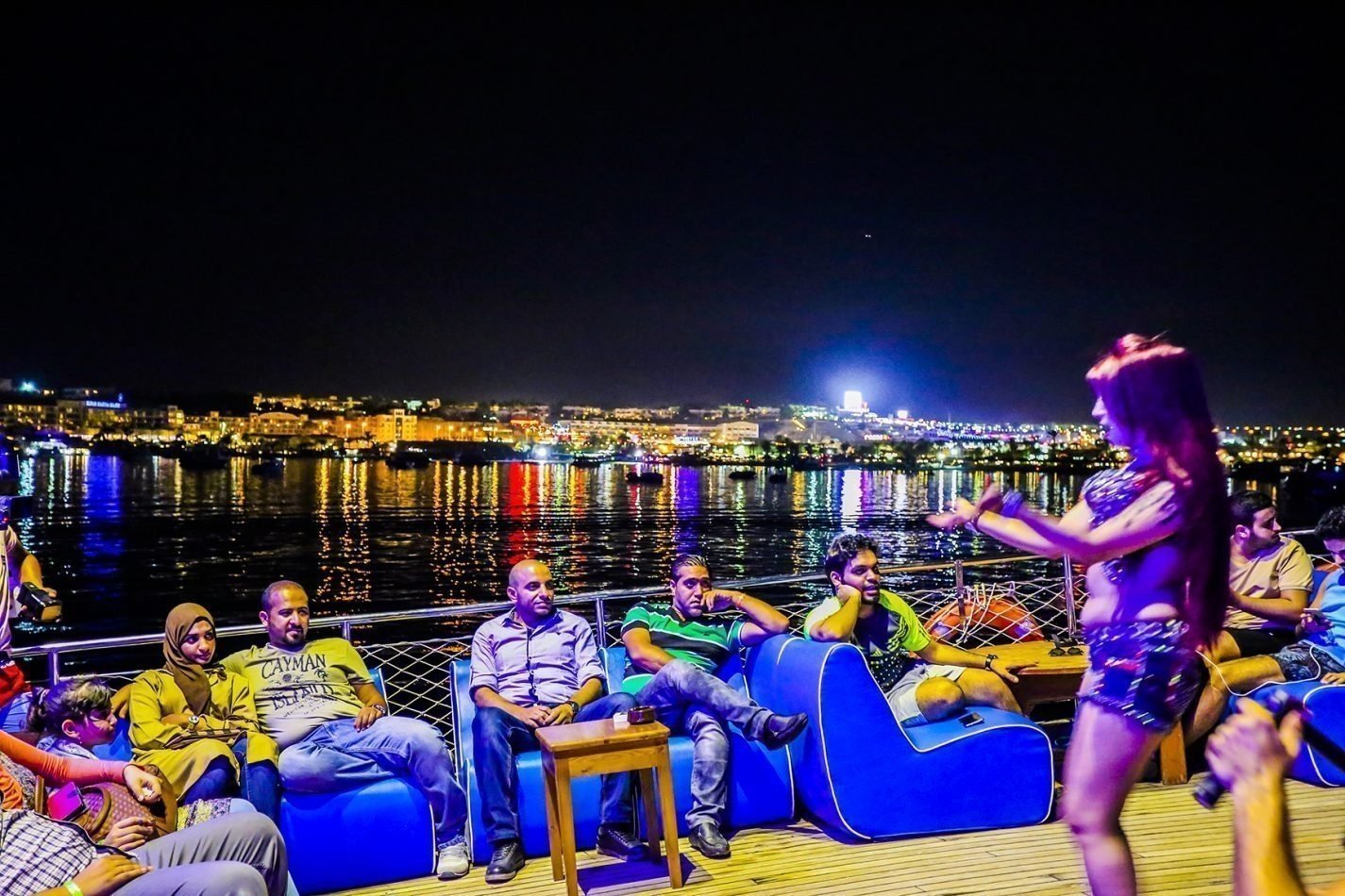 Cena Sulla Barca Sharm El Sheikh, Avrete la possibilità di godervi una serata indimenticabile, al calar del sole, a bordo di una mini crociera nel Mar Rosso, con i vostri fidanzati, con la vostra famiglia o con gli amici più cari. Offrite loro una cena romantica, con ottima selezione di piatti a base di pesce a bordo di uno yacht che naviga lungo il golfo di Suez. Cena deliziosa accompagnata da musica dolce e inglese, con calda brezza del mar rosso che rimarrà nella vostra memoria per molto tempo. Vi offriamo vari spettacoli di ballo come quello orientale, del fuoco, del tanura, di magia e del ventre. Vi offriamo anche la possibilità di festeggiare, con torta a sorpresa gratuita, i vostri compleanni o anniversari.
