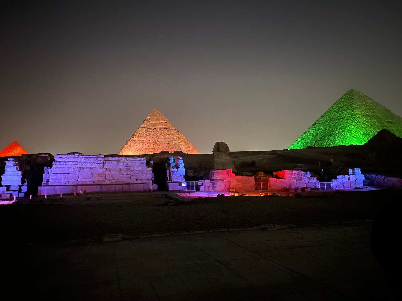 Lo Spettacolo luci Giza si svolge ogni sera dopo il tramonto e consiste nell’illuminazione delle tre piramidi di Giza con luci colorate e proiezioni video che raccontano la storia dell’antico Egitto e delle piramidi stesse. La colonna sonora include una narrazione in diverse lingue che descrive gli avvenimenti storici e la mitologia egizia.